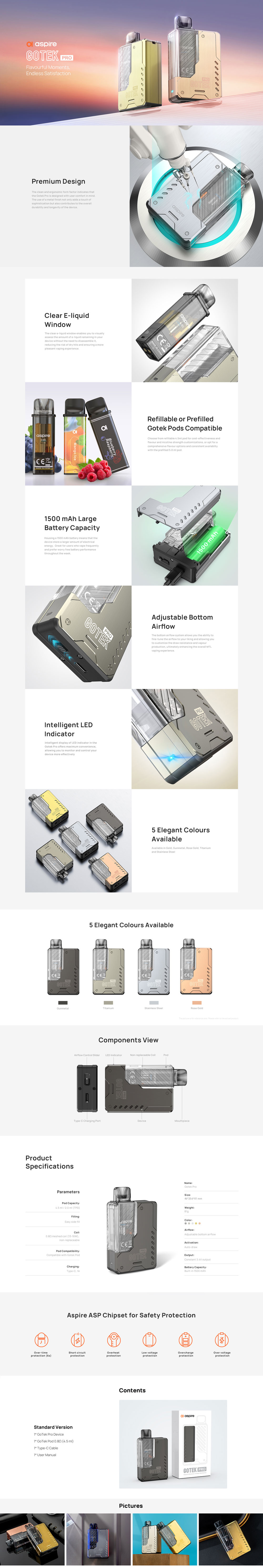 Aspire nous propose une version Pro de ses pods Gotek. Le pod Gotek Pro s'offre une fabrication plus qualitative en aluminium ainsi qu'une autonomie plus que doublée avec sa batterie interne de 1500 mAh. Activation auto draw très simple d'utilisation et cartouche grande capacité de 4.5 ml équipée d'une résistance intégrée de 0.8 ohm.